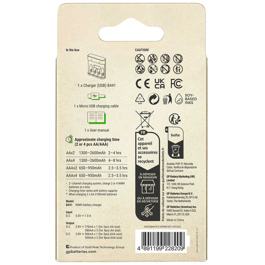 GP ReCyko B441 USB Şarj Cihazları, ilk kez NIMH şarj edilebilir kullanıcıları hedefliyor. Tüketici elektroniği cihazlarında en güvenli güç ve iletişim portu olarak algılanan USB portunun popülaritesinden yararlanan bu modeller, 2600mAh AA veya 950mAh AAA pili sırasıyla yaklaşık 8 ve 4 saatte şarj edebilen ekonomik şarj çözümü sunar. Küçük boyutlu, hafif ve kompakt, şarj durumunu görüntülemek ve arızalı, bozuk pilleri tespit etmek için LED göstergeli.